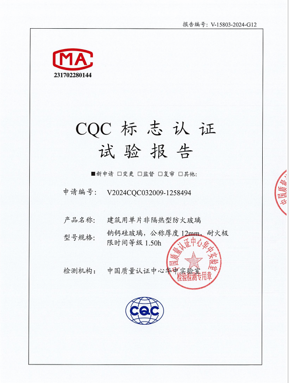 单片非隔热防火玻璃8mm防火证书